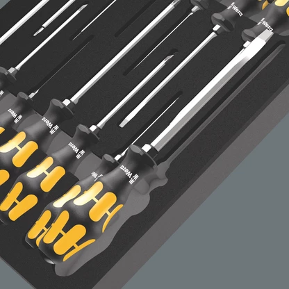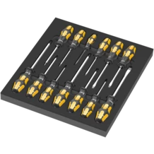 Insert en mousse durable ; bicolore pour repérer rapidement les pièces manquantes ; compatible avec la servante d'atelier Tool Rebel. Équipé de 13 tournevis-burins Wera Kraftform.