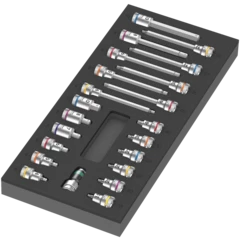 • 14 douilles, 9 douille-embouts avec fonction de retenue pour vis TORX®, 9 douille-embouts avec fonction de retenue pour vis à six pans creux