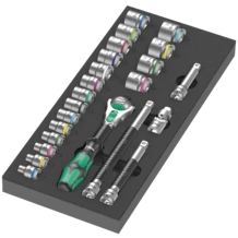 Insert en mousse durable ; bicolore pour repérer rapidement les pièces manquantes ; compatible avec la servante d'atelier Tool Rebel ; équipé de 1 cliquet Wera Zyklop Speed 3/8" et 22 accessoires.