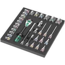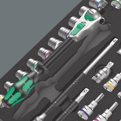 Insert en mousse durable ; bicolore pour repérer rapidement les pièces manquantes ; compatible avec la servante d'atelier Tool Rebel ; équipé du cliquet Wera Zyklop Speed 1/2" et 30 accessoires.
