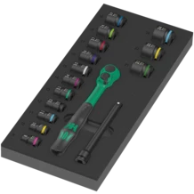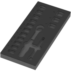 Insert en mousse durable ; bicolore pour repérer rapidement les pièces manquantes ; compatible avec la servante d'atelier Tool Rebel. Avec 1 cliquet Zyklop Comfort 8010 B, 3/8", 14 douilles 8790 B Impaktor 3/8", 1 rallonge Zyklop 8798 B, 3/8".