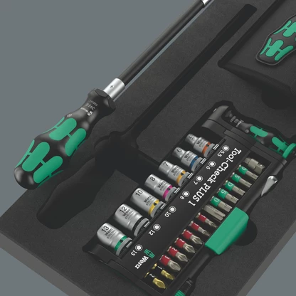 • Tool-Check PLUS : ensemble d'outils de 39 pièces réunissant cliquet, embouts, douilles et un manche