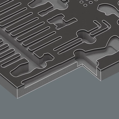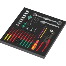 Insert en mousse durable ; bicolore pour repérer rapidement les pièces manquantes ; compatible avec les servantes d'atelier Tool Rebel ; équipé de 1 manche Kraftform Kompakt 817 VDE et 10 lames interchangeables pour les empreintes suivantes : Phillips, Pozidriv, TORX®, six pans creux et fente, 1 cliquet Zyklop Speed (1/4"), 8 douilles (1/4"), 1 rallonge (1/4", 50 mm de long), 1 adaptateur (carré 1/4" vers hexagonal 1/4") pour embouts 1/4", 1 porte-embouts universel pour visseuse pour embouts 1/4", 16 embouts (25 mm de long) pour les empreintes suivantes : Phillips, Pozidriv, TORX®, six pans creux et fente ; 2 clés coudées avec fonction de retenue pour vis à six pans creux (taille 3,0 et 4,0), 1 clé double fourche Joker 6002 (taille 17 et 19), 1 clé à fourche auto-ajustable 6004 Joker S pour les vis à tête hexagonale et écrous hexagonaux de largeur 10,0 ; 11,0 ; 12,0 ; 13,0 (système métrique) ou 7/16" ; 1/2" (système impérial), pince multiprise de pointe KNIPEX Cobra® 87 01 250.