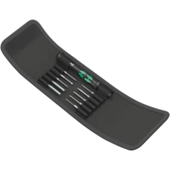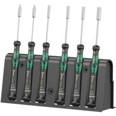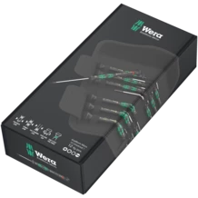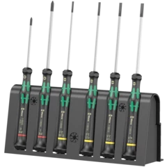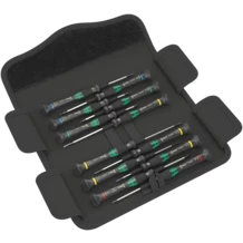Tournevis Wera Micro en assortiment, pour vissages en mécanique de précision. La crête pivotante servant d'appui à la main et la zone de rotation rapide située juste en-dessous permettent un "tortillement" très rapide. Le repositionnement fastidieux de la main n'a plus lieu d'être. Rangement et transport dans un robuste étui portable à la ceinture, permettant d'avoir toujours les outils à portée de main.