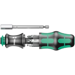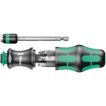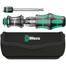 Les outils compacts Wera permettent l'emploi simultané des deux types de vissage : "main" et "machine". Le système associant manche et lames interchangeables en format compact, avec différentes pointes logées dans un espace ultra-réduit, se traduit par un gain évident de mobilité et de souplesse pour l'utilisateur. Convient pour embouts à emmanchement hexagonal 1/4"répondant aux normes DIN ISO 1173-C 6,3 et E 6,3 ainsi que des séries 1 et 4 Wera. Avec adaptateur, baïonnette, technologie Rapidaptor. Manche Kraftform avec dispositif antiroulement, multicomposants pour un vissage particulièrement ergonomique. Réserve intégrée pour le rangement des embouts. Escamotable dans le manche, la lame baïonnette avec mandrin à serrage rapide autorise, lorsqu'elle est rentrée, une grande vitesse de manœuvre, même en situation de travail confinée. Elle peut être redéployée par simple actionnement de la douille de blocage. Le manche à baïonnette peut alors s'utiliser comme un tournevis à part entière. La lame baïonnette peut être retirée et servir d'adaptateur machine, de même qu'être ramenée en position initiale. Avec étui très pratique portable à la ceinture.