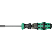 Porte-embouts Kraftform pour embouts 1/4". Le cliquet à fine denture intégré dans le manche permet de travailler rapidement. L'inversion du sens de vissage est intuitive : si on tourne la bague vers la droite, le vissage s'effectue vers la droite. Si on tourne la bague vers la gauche, le vissage s'effectue vers la gauche. Le mécanisme de cliquet peut être désactivé en position 0 pour les travaux de précision. Avec 6 embouts extra-rigides à usage universel ; logés dans le magasin à embouts intégré dans le manche. Le puissant aimant permanent dans l'admission d'embout 1/4" permet un positionnement sûr de l'embout. Le manche bicomposant Kraftform, qui combine les zones dures et tendres, permet une prise en main sûre et un travail précis.