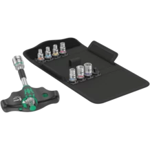 Jeu de 9 pièces dans une housse textile. 1 tournevis adaptateur à manche en T 411 A RA avec fonction cliquet, pour douilles 1/4". Le cliquet intégré à fine denture (80 dents/angle de reprise de 4,5°) simplifie et accélère le vissage. Plus besoin de désengager et repositionner l'outil. Le mécanisme de cliquet entièrement intégré dans le manche rend l'outil très pratique et le travail agréable. Avec levier d'inversion pour changer facilement de sens droite/gauche en un seul geste. La forme ergonomique du manche épouse bien la forme de la paume. Les doigts sont calés dans les arrondis. La main entière est en contact avec le manche, les déperditions par friction entre la main et le manche sont évitées. Pour douilles carrées 1/4" et adaptateurs 1/4" avec carré d'entraînement, avec blocage à bille. 8 douilles Zyklop avec emmanchement 1/4". Repéreur d'outils Take it easy : code couleur en fonction de la taille pour trouver rapidement et facilement l'outil nécessaire.