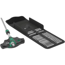 Jeu de 17 pièces dans une housse textile robuste. 1 manche en T 416 RA avec fonction cliquet et mandrin à serrage rapide Rapidaptor pour embouts 1/4". Le cliquet intégré à fine denture (80 dents/angle de reprise de 4,5°) simplifie et accélère le vissage. Plus besoin de désengager et repositionner l'outil. Le mécanisme de cliquet entièrement intégré dans le manche rend l'outil très pratique et le travail agréable. Avec levier d'inversion pour changer facilement de sens droite/gauche en un seul geste. La forme ergonomique du manche épouse bien la forme de la paume. Les doigts sont calés dans les arrondis. La main entière est en contact avec le manche, les déperditions par friction entre la main et le manche sont évitées. Porte-embouts pour embouts à emmanchement hexagonal 1/4" selon DIN ISO 1173-C 6,3 et E 6,3. Avec technologie Rapidaptor pour un changement ultrarapide des embouts. 16 embouts extra-rigides, ¼", 89 mm de long, à usage universel.