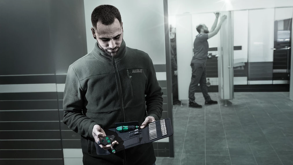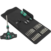 Jeu de 18 pièces dans une housse textile robuste. 1 manche en T 416 RA avec fonction cliquet et mandrin à serrage rapide Rapidaptor pour embouts 1/4". Le cliquet intégré à fine denture (80 dents/angle de reprise de 4,5°) simplifie et accélère le vissage. Plus besoin de désengager et repositionner l'outil. Le mécanisme de cliquet entièrement intégré dans le manche rend l'outil très pratique et le travail agréable. Avec levier d'inversion pour changer facilement de sens droite/gauche en un seul geste. La forme ergonomique du manche épouse bien la forme de la paume. Les doigts sont calés dans les arrondis. La main entière est en contact avec le manche, les déperditions par friction entre la main et le manche sont évitées. Porte-embouts pour embouts à emmanchement hexagonal 1/4" selon DIN ISO 1173-C 6,3 et E 6,3. Avec technologie Rapidaptor pour un changement ultrarapide des embouts. 14 embouts extra-rigides, ¼", 89 mm de long, à usage universel. 2 douilles pour vis en version magnétique : pour un positionnement plus facile des embouts.
