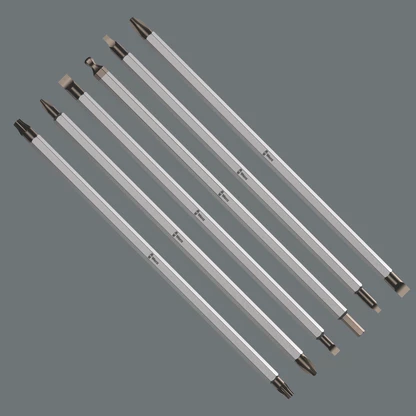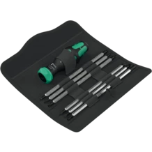 Jeu de lames interchangeables 7 pièces. 1 manche Kraftform avec admission six pans creux 6 mm pour lames combinées (lames doubles) de la gamme Wera Vario. Le cliquet à fine denture intégré dans le manche permet de travailler rapidement. L'inversion du sens de vissage est intuitive : si on tourne la bague vers la droite, le vissage s'effectue vers la droite. Si on tourne la bague vers la gauche, le vissage s'effectue vers la gauche. Le mécanisme de cliquet peut être désactivé en position 0 pour les travaux de précision. Le manche bicomposant Kraftform, qui combine les zones dures et tendres, permet une prise en main sûre et un travail précis. 6 lames doubles Wera Vario (= 12 empreintes différentes), 175 mm de long, hexagonal 6 mm. Dans une pochette pliable robuste.