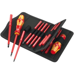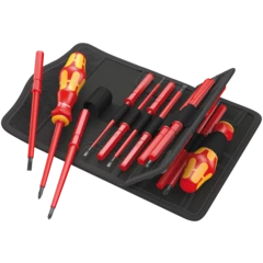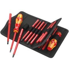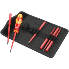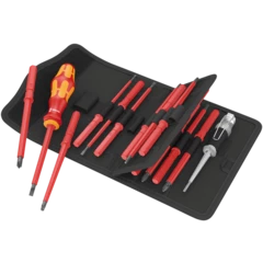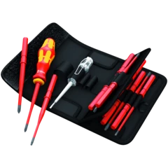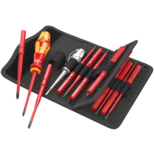 14 lames interchangeables VDE (isolées) à diamètre réduit permettant également d'atteindre et d'actionner les éléments à vis et à ressort situés en profondeur. Manche 817 VDE Kraftform pour un travail ergonomique plus testeur de phase unipolaire, le tout réuni dans un robuste étui portable à la ceinture. Outils testés un par un conformément à la norme IEC 60900. Contrôle pièce à pièce à 10 000 V, pour un travail en toute sécurité sous la tension admissible de 1 000 V.