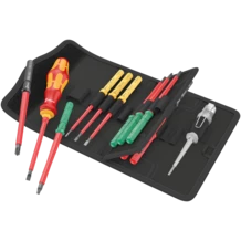 1 porte-embouts 817 VDE Kraftform, 14 lames interchangeables VDE avec repéreur d'outils Take it easy : code couleur en fonction des empreintes et indication de la taille gravée au laser - pour trouver rapidement et facilement l'outil nécessaire, 1 testeur de tension unipolaire. Outils contrôlés pièce à pièce conformément à la norme IEC 60900. Contrôle pièce à pièce à 10 000 V pour travailler en toute sécurité sous la tension admissible de 1 000 V. Dans une trousse de ceinture robuste. L'étui textile présente une zone boucles au dos. La bande scratch autocollante fournie permet de fixer l'étui textile aux composants Wera 2go. Ou bien au mur, à l'étagère ou à la servante d'atelier.