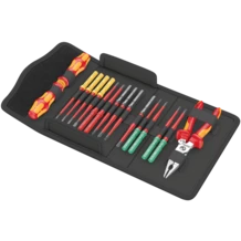 2 porte-embouts 817 VDE pour lames interchangeables VDE Wera ; 14 lames interchangeables VDE (de 157 mm de long chacune) avec diamètre réduit (diamètre de lame standard pour les articles Kraftform Kompakt 60 i Take it easy 0,4x2,5 et Kraftform Kompakt 67 i Take it easy TX 10), permettant d'atteindre et d'actionner les éléments à vis et à ressort profondément encastrés. Avec repéreur d'outils Take it easy : code couleur en fonction des empreintes et indication de la taille gravée au laser - pour trouver rapidement et facilement l'outil nécessaire. Outils contrôlés pièce à pièce à 10 000 V conformément à la norme IEC 60900 pour travailler en toute sécurité sous la tension admissible de 1 000 V. 1 pince Knipex pour installations électriques VDE 13 96 200 ; la pince remplace jusqu'à 6 outils individuels pour les installations électriques : couper, dénuder, saisir, plier, ébavurer et sertir - le tout en un seul outil. Avec cliquet de blocage pour faciliter la prise en main. Chromée pour une meilleure protection antirouille, avec poignées isolées multicomposants. Dans une trousse de ceinture robuste. L'étui textile présente une zone boucles au dos. La bande scratch autocollante fournie permet de fixer l'étui textile aux composants Wera 2go. Ou bien au mur, à l'étagère ou à la servante d'atelier.