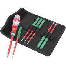 1 manche 3817 VDE Kraftform pour travailler de façon ergonomique. 7 lames interchangeables VDE en acier inoxydable, dont certaines à diamètre réduit (iS), permettant d'atteindre et d'actionner les éléments à vis et à ressort même profondément encastrés ; avec repéreur d'outils Take it easy : code couleur en fonction des empreintes et indication de la taille gravée au laser - pour trouver rapidement et facilement l'outil nécessaire. Outils contrôlés pièce à pièce conformément à la norme IEC 60900. Contrôle pièce à pièce à 10 000 V pour travailler en toute sécurité sous la tension admissible de 1 000 V. Les outils en acier inoxydable Wera font l'objet d'une trempe cryogénique sous vide qui leur confère les duretés et indices de résistance nécessaires aux vissages. L'usage industriel est possible sans restriction. Dans une trousse de ceinture robuste. Avec ses bandes à scratch au dos, l'étui peut se fixer au mur, sur une étagère ou une servante d'atelier et est compatible avec le système Wera 2go.