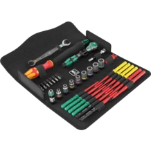 Jeu compact d'outils avec les 35 principaux outils de vissage pour les travaux de maintenance à l'intérieur et l'extérieur. 1 porte-embouts 817 VDE Kraftform réservé aux lames interchangeables VDE Wera ; 12 lames interchangeables VDE (de 157 mm de long chacune) avec repéreur d'outils Take it easy avec code couleur en fonction des empreintes et indication de la taille gravée au laser ; clé double fourche Joker à fonction de retenue, butée terminale, faible angle de reprise et dents à très forte saisie ; cliquet 1/4" Zyklop Speed incroyablement rapide y compris accessoires ; 8 douilles "main et machine" de 5,5-13, porte-embout universel ; 7 embouts de 25 mm ; agrippe-vis pour retenir les vis ; boîte textile, de robustesse et de longévité remarquables ; positionnable debout, pour un stockage bien ordonné sur l'étagère à outils ; protection accrue des surfaces grâce au matériau extérieur textile ; faible encombrement et poids réduit, pour un net gain de mobilité.