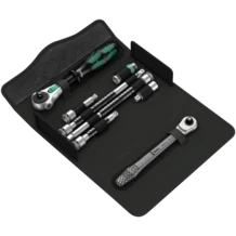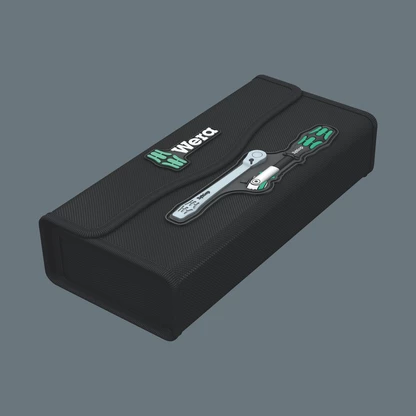 Ensemble cliquets compact, contenant 2 cliquets 1/4" (Zyklop Speed et Zyklop Metal avec levier d'inversion) ainsi que 6 accessoires. Cliquet Zyklop Speed à construction en masse oscillante et douille de rotation rapide haute maniabilité, pour une vitesse de travail élevée ; tête librement orientable ; positions définies à 0°, à 90° vers la gauche et la droite ainsi qu'entre 15° et 90° vers l'intérieur ; utilisable comme un tournevis classique en position 0° ; verrouillage sécurisé des douilles, même en position tournevis ; inversion gauche/droite ; fine denture ; faible angle de reprise (5°) ; manche Kraftform multicomposants pour un travail sans fatigue ; cliquet Zyklop Metal avec levier d'inversion ; forme mince permettant d'œuvrer même dans les espaces très étroits ; fine denture (72 dents) offrant un faible angle de reprise de 5° ; avec levier d'inversion pour un changement de sens aisé ; avec fonction sûre de verrouillage des douilles ; cliquet forgé 100 % métal (chrome-molybdène) pour une robustesse particulièrement élevée doublée d'une haute longévité ; agencement incroyablement compact, permettant de loger un grand nombre d'outils dans un espace réduit ; housse textile extrêmement compacte, de robustesse et de longévité remarquables ; positionnable debout, pour un stockage bien ordonné sur l'étagère à outils ; protection accrue des surfaces grâce au matériau extérieur textile ; faible encombrement et poids réduit, pour un net gain de mobilité.