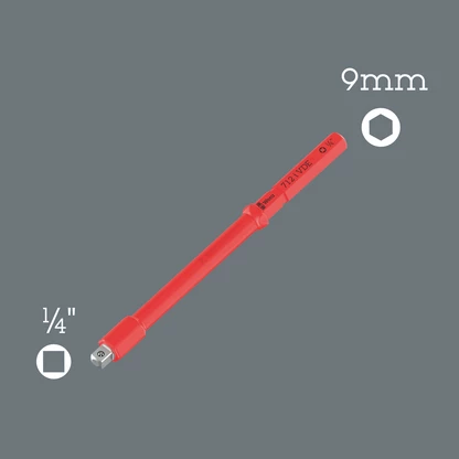 La lame isolée fait office d’adaptateur d’un hexagone mâle 9 mm vers un carré mâle 1/4". Elle peut être utilisée avec les manches isolés Wera Kraftform Kompakt VDE avec admission six pans creux 9 mm.