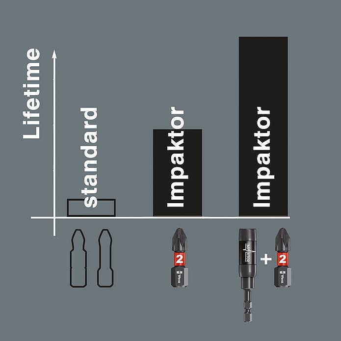 Wera Impaktor – pour charges extrêmes. Avec technologie TriTorsion, revêtement en diamant et aimant annulaire pour une durée de vie maximale, une prise sûre et une productivité optimale lors des vissages mécaniques.