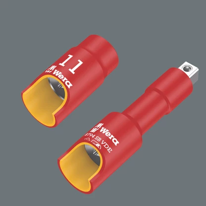 Rallonge VDE 3/8" à sécurité renforcée grâce à l'isolant bi-composant. Un isolant jaune à l'intérieur est surmoulé par un isolant VDE rouge à l'extérieur pour permettre un repérage simple d'un éventuel dommage sur l'isolant. Contrôle unitaire à 100% sous 10.000 V selon l'IEC 60900 pour un travail en toute sécurité jusqu'à 1.000 V.