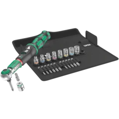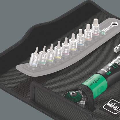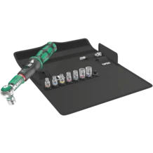 Jeu de clé dynamométrique 1/4" 10 pièces dans une housse textile robuste ; clé dynamométrique avec mécanisme de débrayage. L'outil ne peut pas dépasser le couple réglé de sorte que l'application d'un couple trop élevé est exclue. Plage de réglage de 2 à 12 Nm pour le serrage contrôlé à droite et à gauche. Réglage facile et sécurisation de la valeur définie : le déclenchement audible et perceptible dès que l'on atteint la valeur réglée facilite aussi le réglage sûr du couple souhaité. Avec fonction Torque Lock pour utiliser l'outil comme cliquet standard sans fonction dynamométrique. Peut donc aussi être utilisé pour des applications nécessitant un angle de rotation. Couple de rupture max. du carré 1/4" selon DIN 3122. L'angle de reprise n'est que de 5°, le cliquet peut donc être utilisé même dans les endroits exigus. Contient : clé dynamométrique Safe-Torque A 1, 1/4" carré, 2-12 Nm, 8 douilles avec emmanchement 1/4" et 1 rallonge courte.