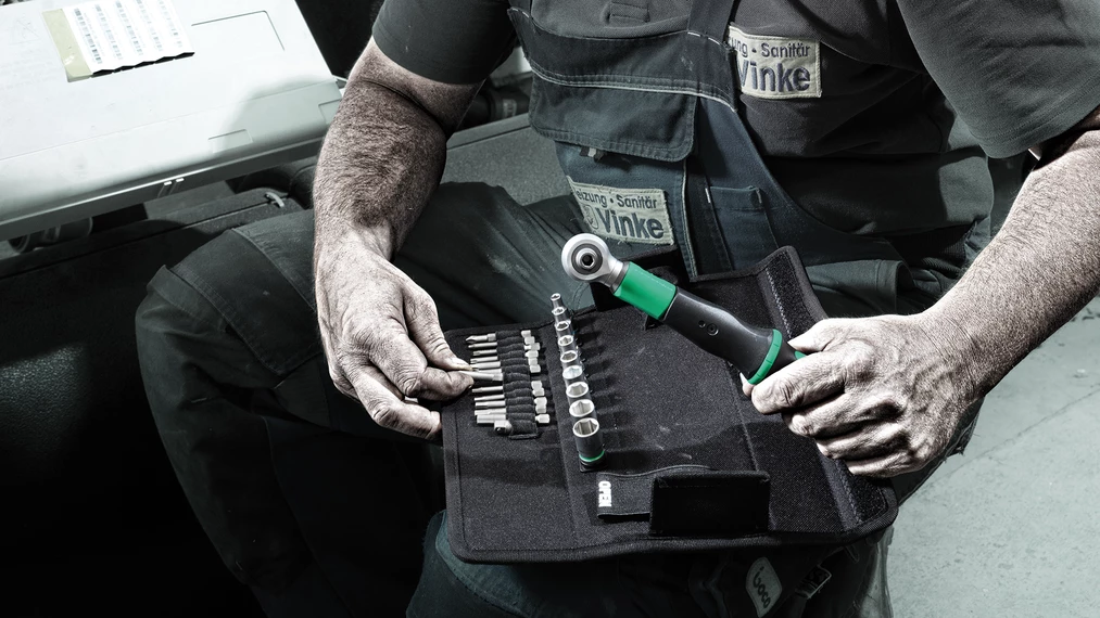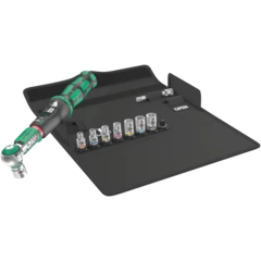 1 clé dynamométrique Safe-Torque A 2 avec emmanchement hexagonal 1/4", plage de mesure 2-12 Nm ; pour le serrage contrôlé à droite et à gauche ; serrage et desserrage avec et sans couple, fonction dynamométrique désactivable (fonction Torque Lock) ; 72 dents ; faible angle de reprise de 5°; réglage simple et sûr du couple souhaité, avec cliquetis audible et perceptible à chaque graduation, mécanisme de débrayage dès que l'on atteint la valeur de couple réglée ; manche ergonomique bicomposant ; 9 douilles Zyklop, 12 embouts (1/4", 50 mm de long), 1 adaptateur pour douilles (hexagonal mâle 1/4" vers carré mâle 1/4").