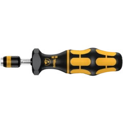 Tournevis dynamométrique Wera. Manche "revolver" Kraftform pour la transmission de couples particulièrement élevés, multicomposant pour une vitesse de travail élevée et un vissage ergonomique. Avec valeur de couple préréglée en usine à la demande du client. Pour toutes les applications qui nécessitent constamment le même couple et une reproductibilité de la précision. La valeur de couple peut être ajustée dans les limites de la plage de mesure à l'aide d'un outil spécial (kit de réétalonnage à commander avec le numéro de code 05137002001). Puis contrôler la valeur réglée à l'aide d'un couplemètre courant. Technologie Rapidaptor pour un changement ultrarapide des embouts. Couple de desserrage illimité pour desserrer les vis grippées. Manche Kraftform multicomposant combinant des zones dures et tendres permettant de travailler rapidement tout en ménageant la paume des mains.