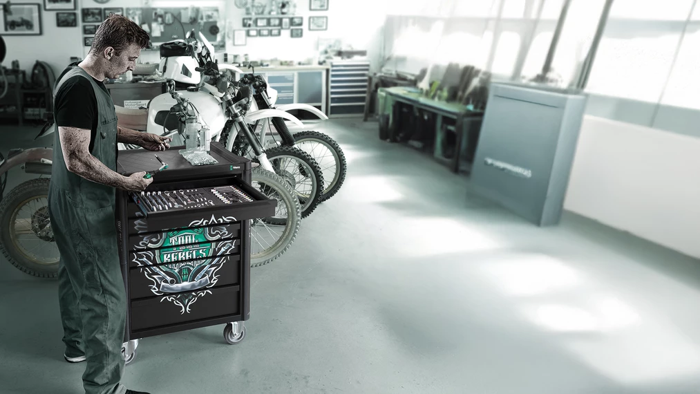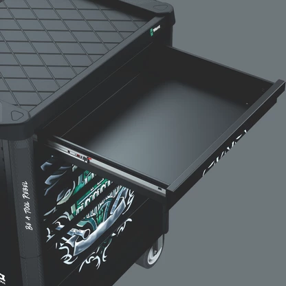 Servante d'atelier exclusive au design Tool Rebel. 5 tiroirs plats et 2 tiroirs hauts offrent un rangement efficace et mobile des outils et du matériel. Conception extrêmement robuste avec sa double paroi et l'assemblage entièrement soudé de tout le corps. Pour le quotidien exigeant du travail en atelier. Équipée de 4 inserts en mousse Wera : 9710 insert en mousse pour jeu de tournevis 1, 9720 insert en mousse pour jeu de cliquets 8000 A Zyklop 1, 9731 insert en mousse pour jeu de clés mixtes 6003 Joker 1, 9740 insert en mousse pour jeu de clés coudées 1.