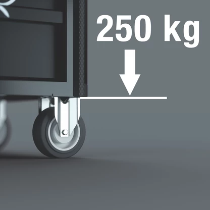 La servante d’atelier Tool Rebel est équipée de grandes roulettes pouvant supporter 250 kg chacune avec des roulements à billes de précision et double cage à billes dans le palier d’articulation. La servante d’atelier se manie facilement même avec une forte charge dynamique.