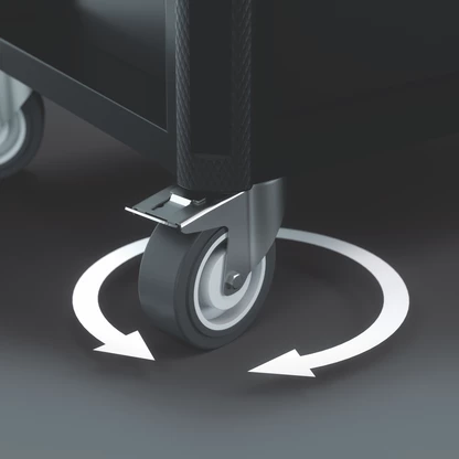 Les 2 roulettes pivotantes sont équipées d’un blocage double : le frein de la roulette empêche efficacement tout déplacement intempestif, le frein du palier d’articulation empêche la rotation non désirée des roulettes pivotantes, par ex. sur les surfaces en pente. Les roulettes élastiques résistantes aux huiles et aux acides permettent un roulement silencieux. Un anneau de protection empêche la saleté et les fils de pénétrer.