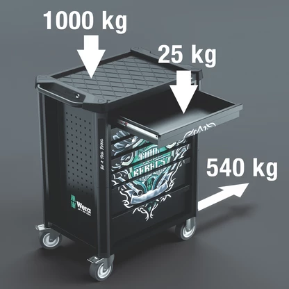 La capacité de charge dynamique de la servante d’atelier est de 540 kg, la capacité de charge statique de 1 000 kg et la capacité de charge des tiroirs est de 25 kg.