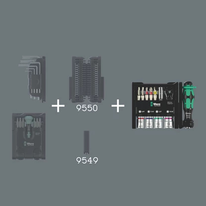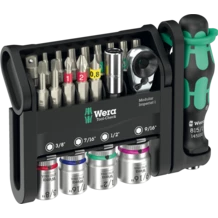 Jeu d'outils 21 pièces ultracompact. 1 manche Kraftform 815/1, pour l'admission d'embouts à emmanchement hexagonal 1/4", 1 cliquet à embout (1/4") 8011 Zyklop Mini 4, avec l'adaptateur inclus 870/1 (hexagonal mâle 1/4" vers carré mâle 1/4") aussi adapté aux douilles 1/4", 1 porte-embouts magnétique 899/4/1 pour visseuses, 9 embouts BiTorsion (BTZ) avec emmanchement hexagonal 1/4" pour vis Phillips, TORX®, vis à fente et à empreinte carrée, 4 embouts extra-rigides (Z) pour six pans creux (tailles en pouces), 4 douilles Zyklop 8790 HMA (tailles en pouces), 1/4". Dans le Tool-Check Modular 1 compact. Peut être associé, avec l'adaptateur rigide Tool-Check Modular 9549 ou la charnière flexible Tool-Check Modular 9550, à d'autres éléments du système Tool-Check Modular.